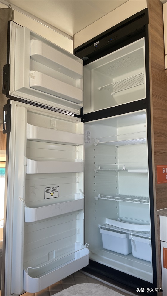 另外,在厨房前部位置还安装有一台冰箱≥200L,超大容积,能够冷藏和冷冻更多的食物,在偏远地区也不用太过担心食材问题。