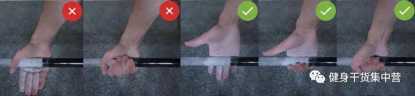注意与大拇指相对的四指与手掌的相对位置,仅仅是勾住杠铃,而非握紧