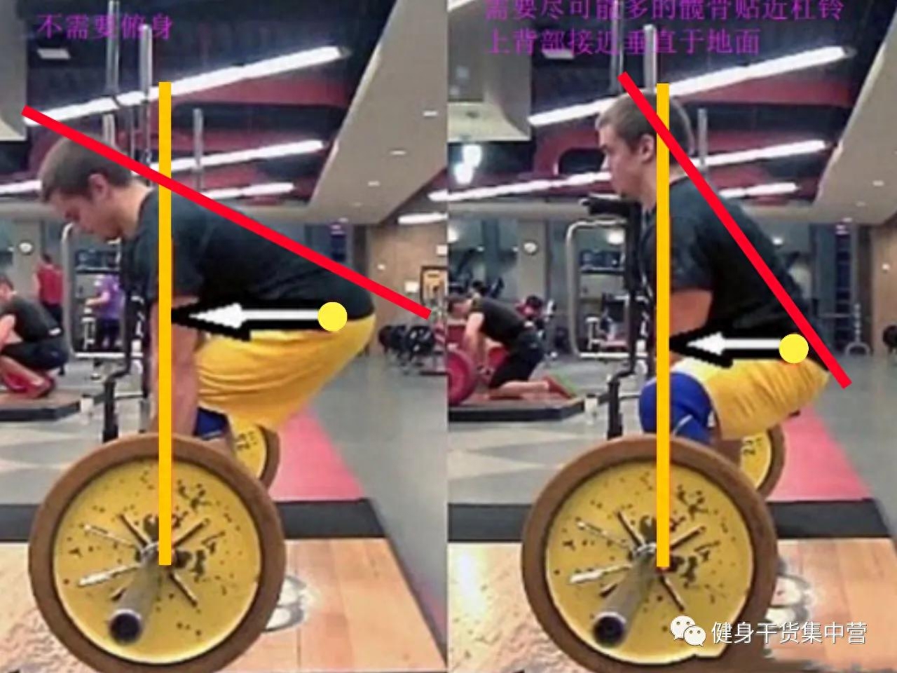 当你的髋骨更加贴近杠铃的时候,你的后背从侧面看,应该更加接近垂直于地面的角度,上图右图