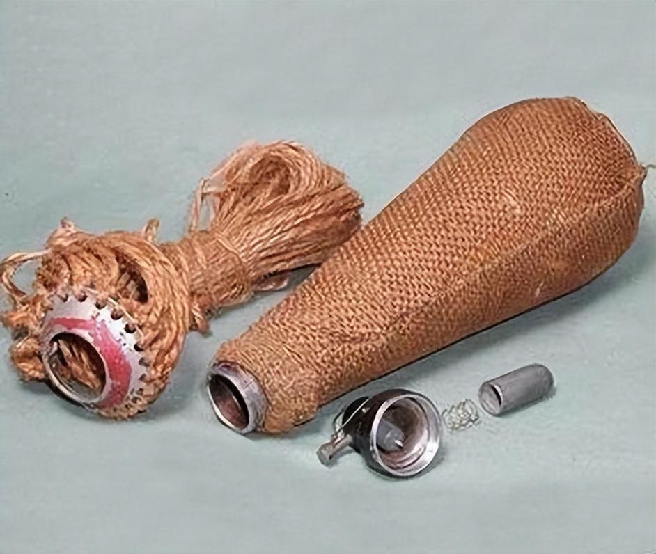 三式反战车手榴弹是日本专门研制用来对付美军坦克的,这种手榴弹的外观像是一个圆锥状的瓶子,外部包裹着麻布,通过牵引麻绳甩开,就像投掷链球一样丢到坦克上实现反坦克的效果。