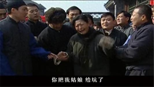 小胡总管们帮金二骗婚,从说媒到相亲,甚至结婚现场还企图拦着不让申家人进场。申母发现被骗,当场要求退婚,小胡总管及那一圈看客又多加威逼,让申母不知所措。