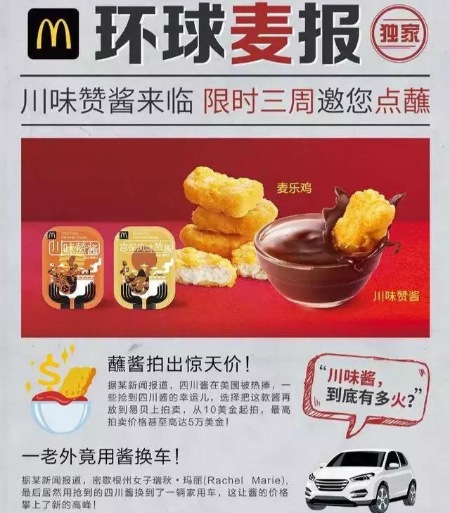 这款网红辣酱在全球购物网站ebay上被炒到5万美元的天价,还有人愿意拿大众汽车来换。围观了美国人的种种夸张的追捧,中国吃货们也很好奇,麦当劳当然不会错过这个机会,这款四川辣酱从3月28日至4月17日在中国限时发售,名为“川味赞酱”。