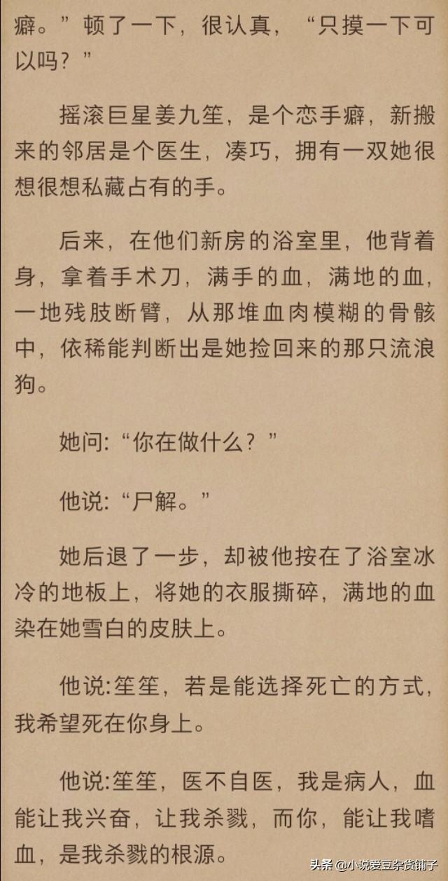 女主是摇滚女星,这个职业还挺少见的 ,哈哈哈,可甜可盐,男女通杀。男主是医生,但是他的手术刀可不止能救人哦,男主非善类,病娇偏执类,只有女主能治愈他。两个人都A爆了,谈起恋爱来,遇神杀神,遇鬼杀鬼!都会拼了命的护着对方。女主和其他小说最不一样的就是,她可以接受男主的一切,就算他黑化,残忍,和他外表不一样,女主也可以包容一切,即使要堕入地狱。