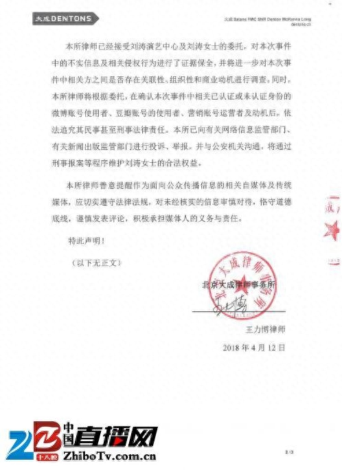 工作室发文称针对部分“自媒体”、“营销账号”恶意制造散播谣言,借助昨晚“无指名爆料”热度的恶意宣传炒作行为,本工作室声明如下:部分平台自媒体和网友恶意散布谣言的行为已严重侵害刘涛女士的个人名誉与形象,已委托律师对本次事件进行处理。在国家大力整顿互联网非法恶俗信息的时期下,此类账号仍不顾国家相关法律规定,恶意中伤,哗众取宠,在这里提醒广大网友不信谣、不传谣,遵守法律法规,恪守道德底线,谨慎发表言论!