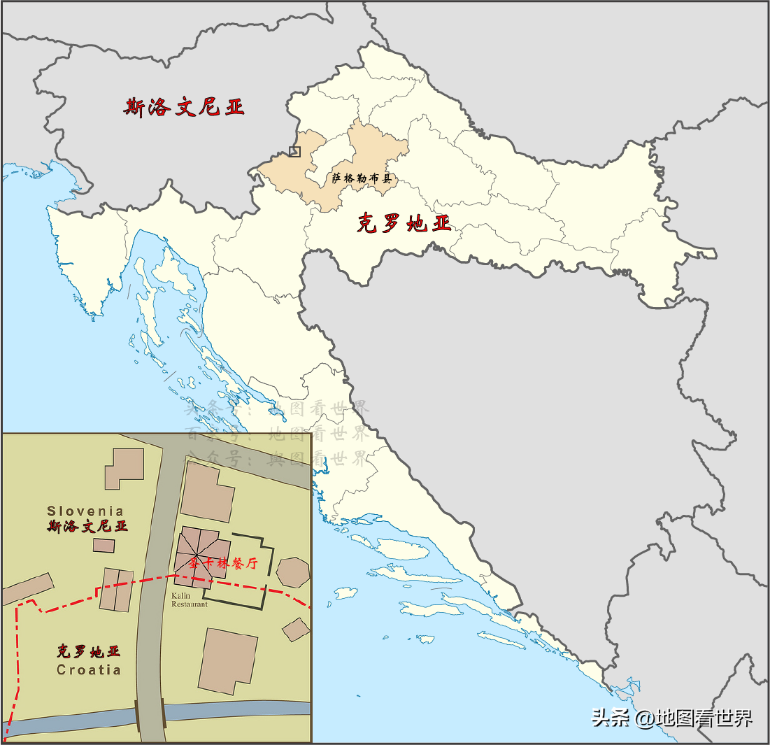 在克罗地亚萨格勒布县与斯洛文尼亚边境城市布雷加纳市中间,有一个独一无二的跨国餐厅——圣卡林餐厅。克罗地亚和斯洛文尼亚国界线从餐厅中间穿过,客人可以就餐在斯洛文尼亚,如厕在克罗地亚。