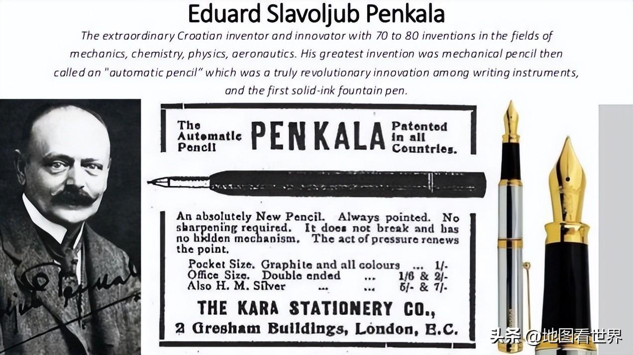 钢笔的英文名字(Pen)起源于发明它的人名——Slavoljub Eduard Penkala。彭卡拉是克罗地亚著名发明家,持有专利70余项。1903年,彭卡拉发明了暖水瓶;1906年,彭卡拉发明了自动铅笔;1907年,彭卡拉发明了自来水笔。1911年,彭卡拉在萨格勒布市创建了世界第一个生产自来水笔的工厂——Pens Factory Zagreb。