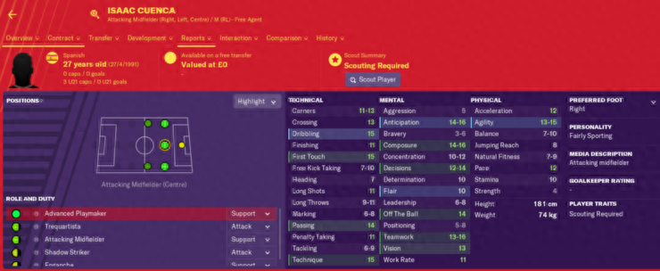 前巴萨球员昆卡,纯正拉玛西亚出身。在离开诺坎普之后,一路漂泊。西甲的拉科鲁尼亚和格拉纳达,土耳其的布尔萨体育,以色列贝尔谢巴工人队都曾成为他的落脚点。在FM2019中,这位西班牙中场依旧拥有不俗的技术属性,但是身体属性偏弱,不过不失为一些中下游球队的好选择。
