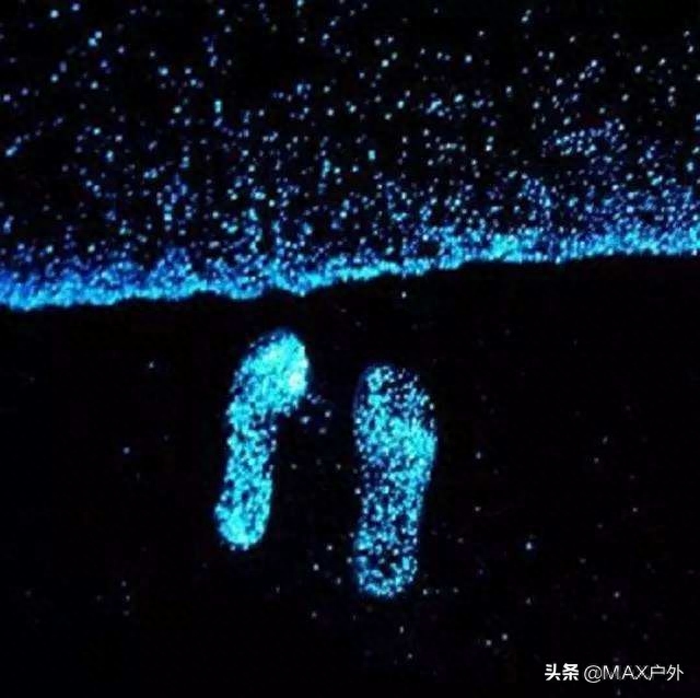 光着脚丫走在海滩边的海水里,每动一下,脚下海水就变荧光,上岸踩在湿的沙地上,还能留下荧光的脚印。