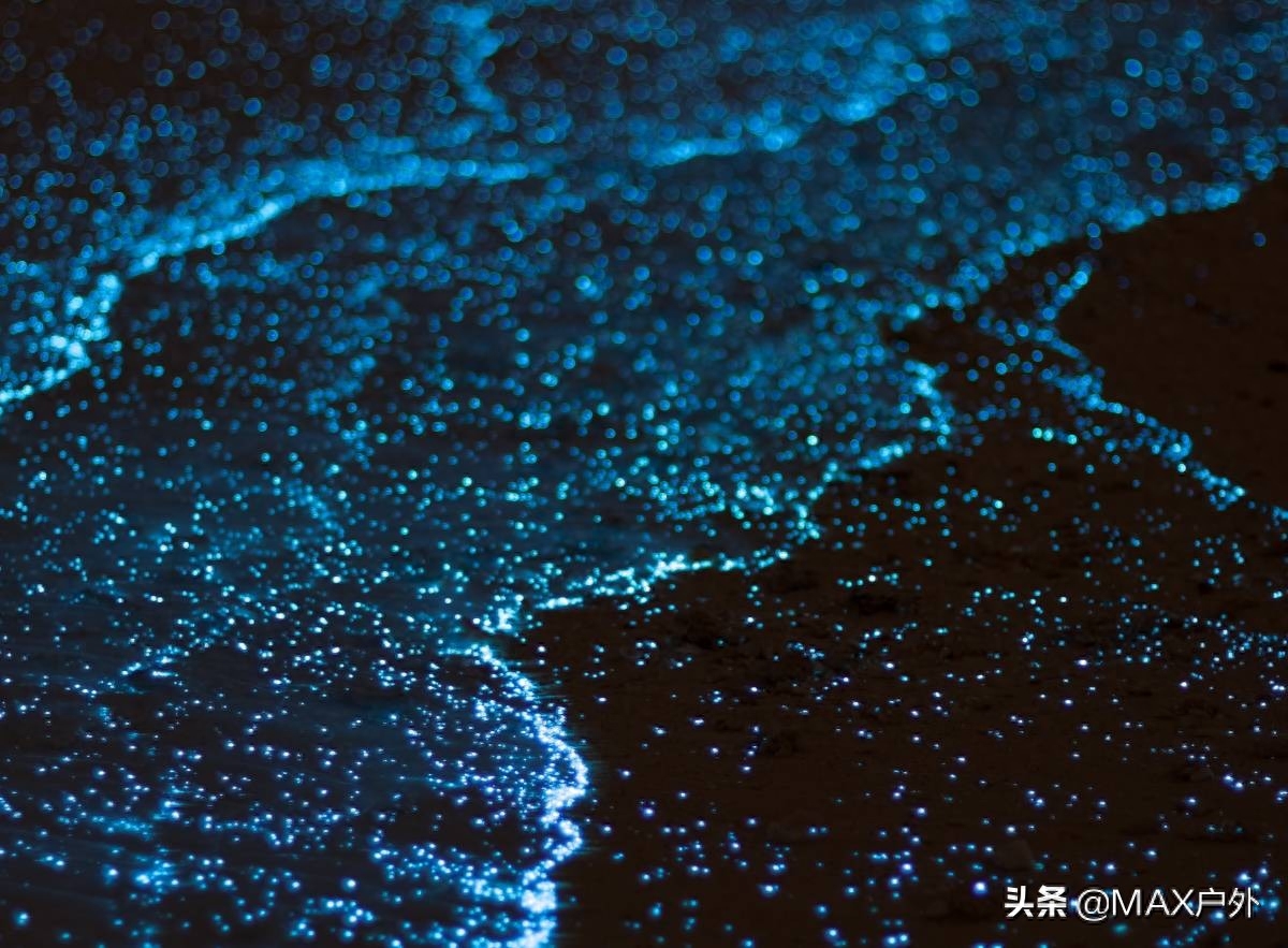 荧光被海浪冲到岸边,连绵成片,闪烁发光的海水一浪又一浪地涌到岸边,神秘浪漫,犹如璀璨的星河。