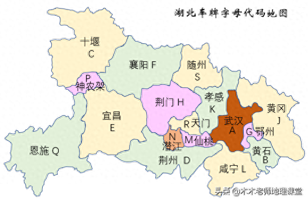湖北省各直辖行政区民用车牌字母代码共有17个,数量不少,又不能按人口规模或经济实力规律记忆。怎样记住它们呢?我们可以用地理学科的方法,把17个车牌字母标在下面的湖北地图上。这样是不是好记一些呢?