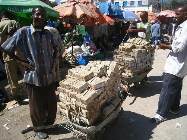 可这一来就彻底击垮了他们的货币体系。津巴布韦的货币是全世界面值最大的货币了,在他们那里人们买卖东西的现金都是论口袋算的,上趟洗手间呢是一百万,买一盘鱼香肉丝是100万亿。