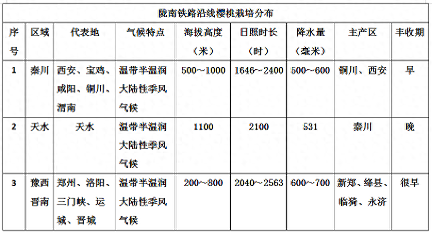 除了环渤海地区之外,中国另一个大樱桃的重要产区位于陇海铁路沿线,包括豫西晋南、陕西秦川、甘肃天水三个小产区,年产量约占全国两成。陕西铜川大樱桃、甘肃天水秦州大樱桃也都名声在外。四川汶川地区和汉源山地也是大樱桃的产区之一,不过产量并不大。