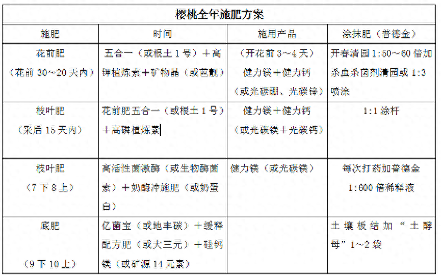 樱桃与其它果树的生长习性有所不同。樱桃的果实成熟期多在春夏之时(大棚樱桃更早),对钾和钙元素需求量较大,把握花前浇水和施肥将决定当年的品质和效益;而樱桃的花芽分化期特别短,仅仅只有果实采摘后的短短15天时间,此期对磷的需求量较高,把握花芽分化期的营养补充将为下一年产量奠定基础。樱桃的枝叶生长和营养合成以及转换都集中在后期,对氮的需求较大,树势强弱,枝叶优劣,主要是靠樱桃树后期的生长情况但一定要控制氮肥施用量,注意观察木质熟化度。