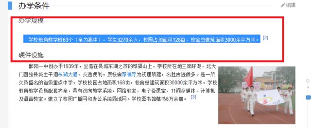 百科信息显示:鄱阳一中有教学班84个(包括高三复读班),学生14000余人,教职工467人(不含退休教工113人),校园占地面积168亩,校舍总建筑面积30000余平方米。而后面又有一句:学校现有教学班63个(全为高中),学生3270余人,校园占地面积128亩,校舍总建筑面积3000余平方米。