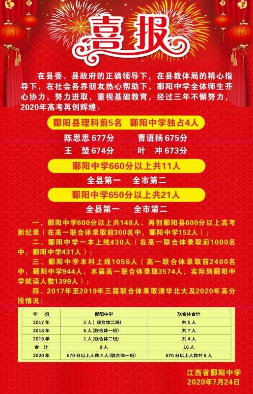 有些家长可能会被一本上线率误导,真的会。比如,小编就差一些被误导了。鄱阳的教育成败,取决于一个学校的高分考生有多少,有没有形成一个高分群体。就拿鄱阳民办高中来说,通过优待的方式争取几个优等生就读,总会在高考时捉襟见足。高分考生没有鄱阳中学多,不知道鄱阳一中有没有反思?