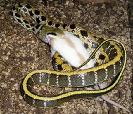 黑眉锦蛇别名家蛇﹑秤星蛇﹑菜花蛇﹑黄颌蛇﹑枸皮蛇﹑黄喉蛇﹑慈鳗﹑黄长虫﹑广蛇等。黑眉锦蛇喜食鼠类,常因追逐老鼠出现在农户的居室内、屋檐及屋顶上,在南方素有“家蛇”之称,被人们誉为“捕鼠大王”,但是黑眉锦蛇是制备药蛇酒和五蛇胆的原料之一常被人类捕杀,数量不断锐减。