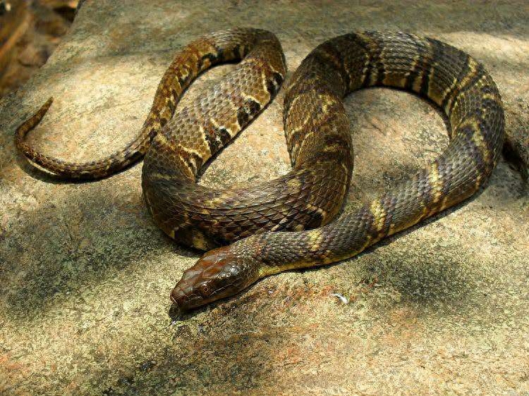 环纹华游蛇,俗称水老蛇,身上有圈状环纹,有在溪边树枝上晒太阳的习惯,性格凶,虽然和著名毒蛇金环蛇、银环蛇一样具有环状,但无毒。