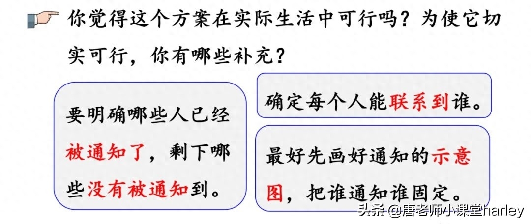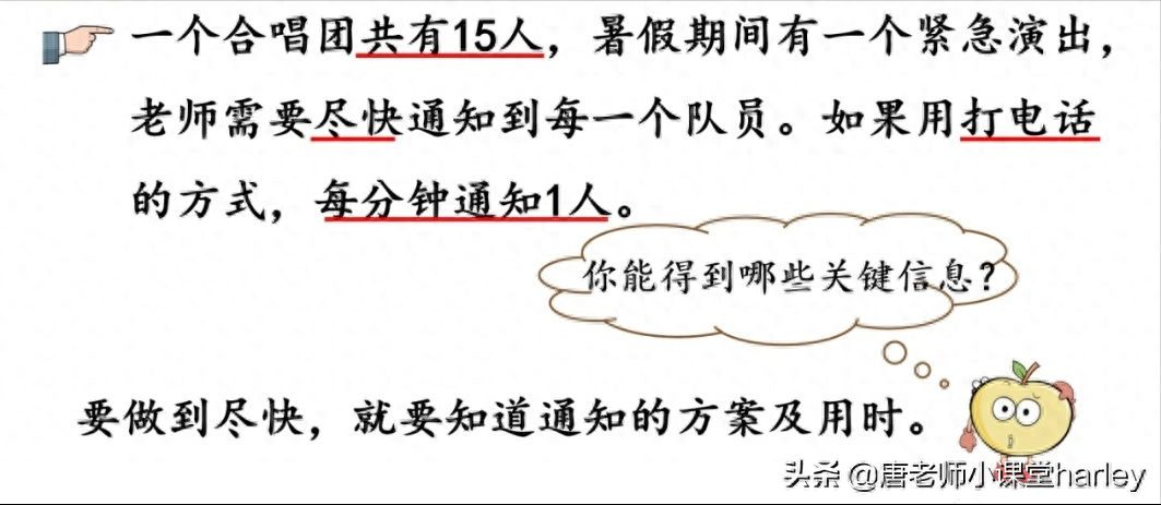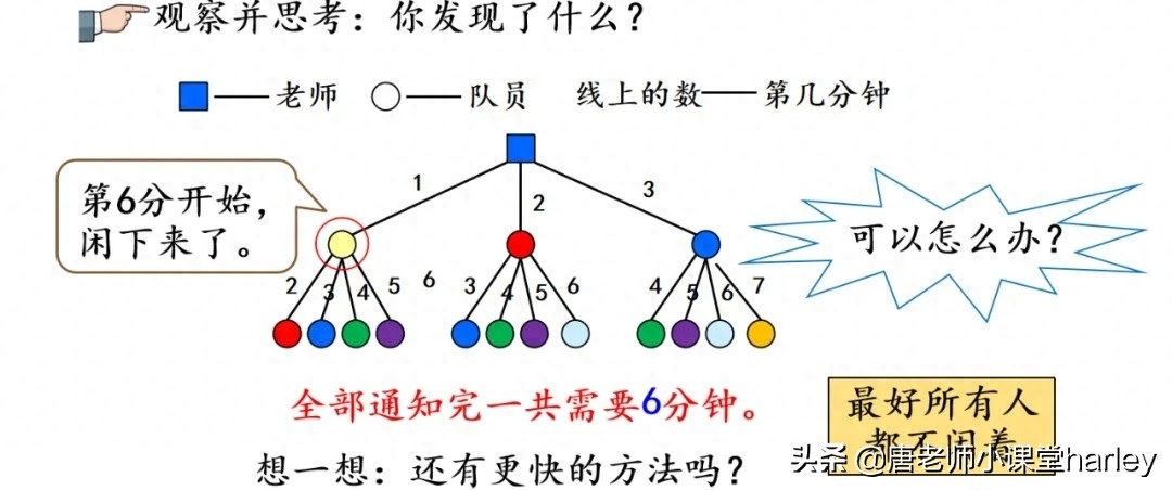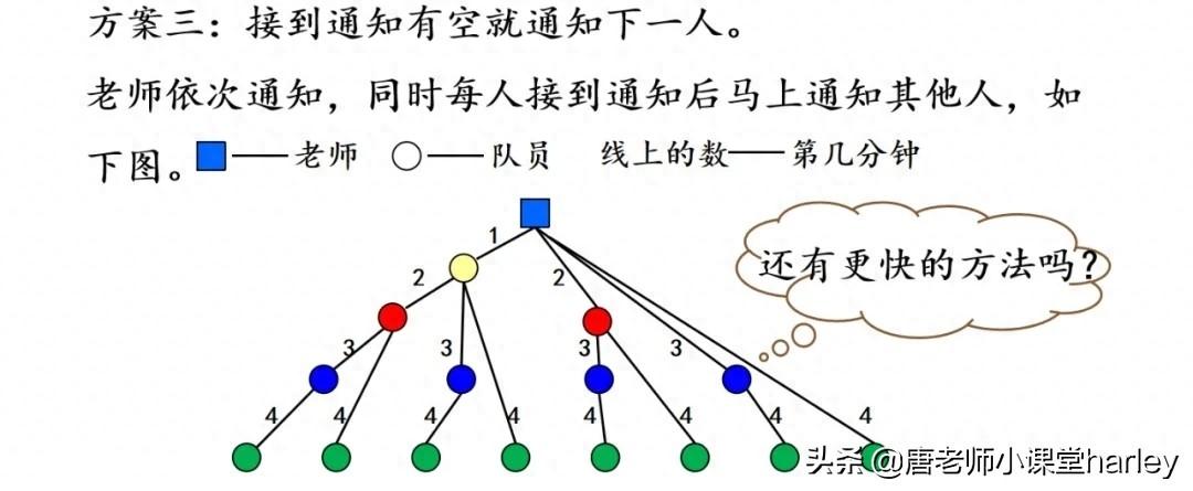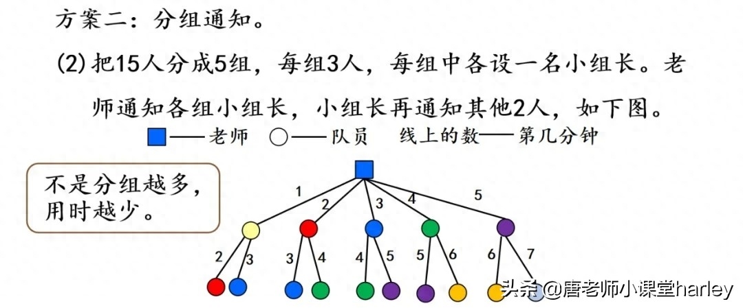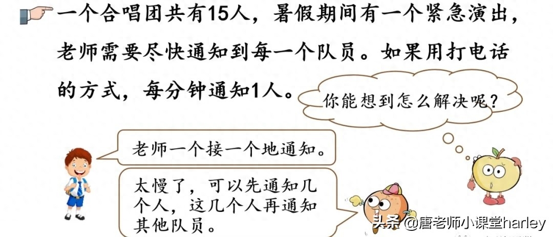 其实打电话最核心的问题应该是,想要知道用什么方法能使所有的人在最短的时间内收到通知。大家在学习的时候可以和同学一起进行讨论与探究,各自从自己的情况出发进行计算,然后再进行讨论,看谁的方案是最优的。