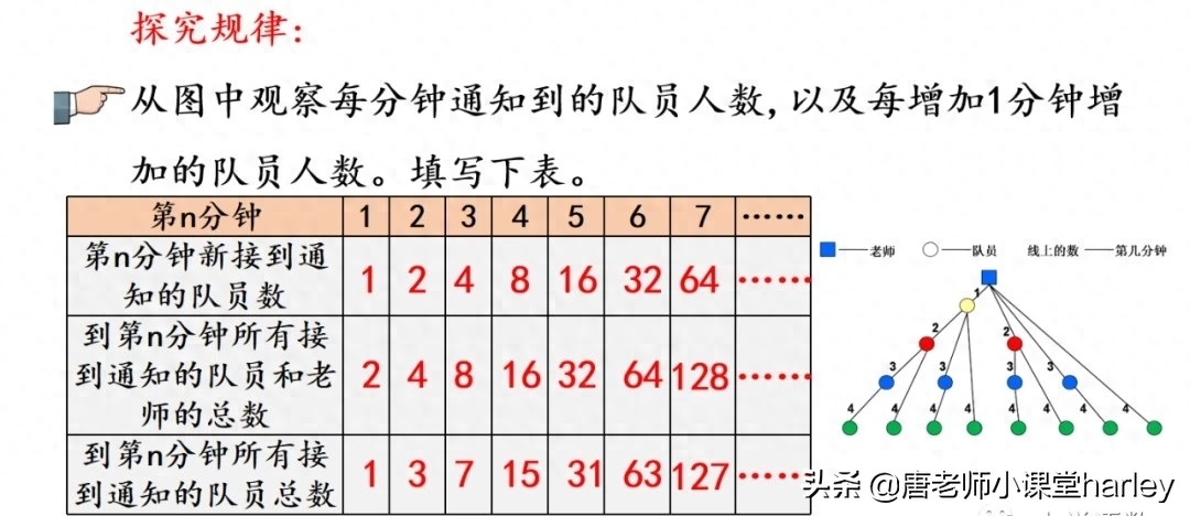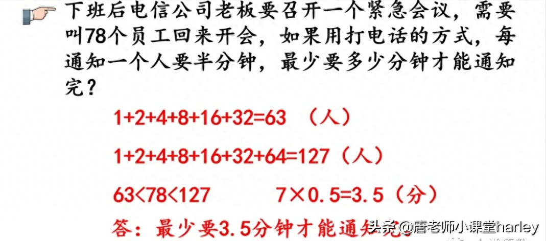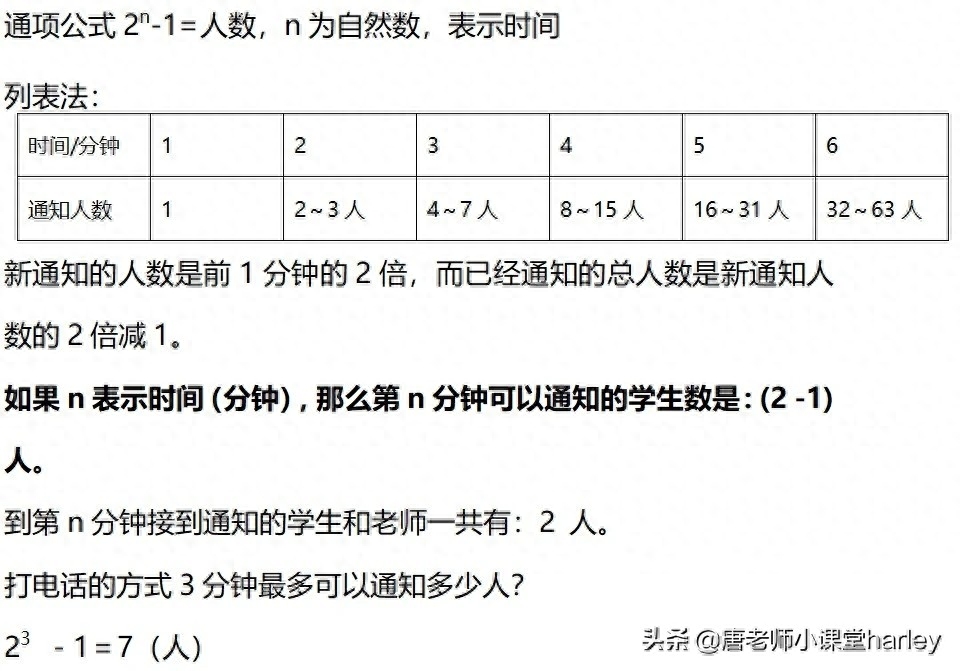 写在最后:打电话问题在同学们学习的时候是比较困难的一部分,它考验的是大家在解决实际问题当中的归纳推理能力,通过推理的过程,可以锻炼大家对解决实际问题的方式和方法,那么最后其打电话的最优方案选择应该是每个队员接到通知之后都不空闲,继续往给其他人打电话才是最快的方案,其所需要的时间和能够通知到的人之间的关系应当是n个二相乘减去一(n为分钟)。