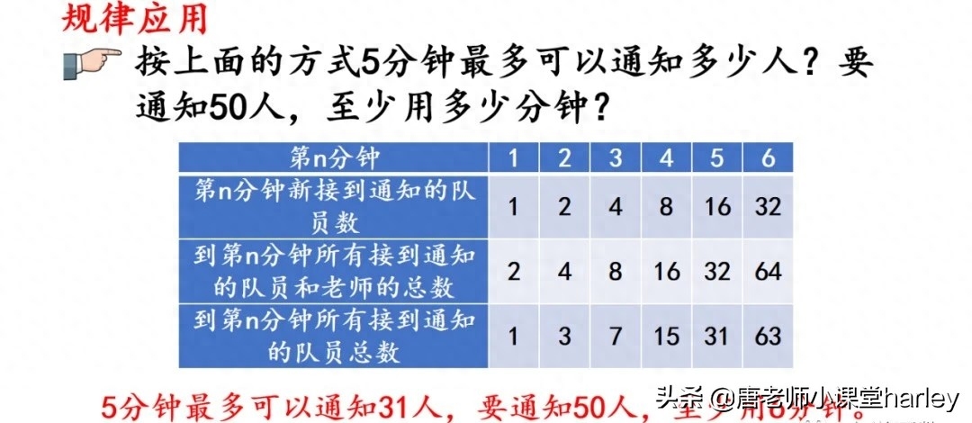 我们发现只有每个接到通知的队员都继续通知后面的队员,直到全部通知到为止,这样每个接到通知的队员都不会空闲,才是最快的方案。其规律就是n分钟通知的人数为n个二相乘再减去一。