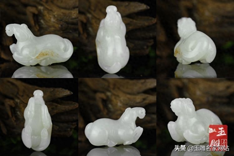 与之相对的便是圆雕这种立体雕刻形式。圆雕的立体不仅局限于一个面,而是360°、上下左右全方位都要照顾到。我们看下图这件玉雕《马到成功》,我们从正面、侧面、底部和顶部观察,都是一个完整而立体的雕件。这就是所谓的圆雕。