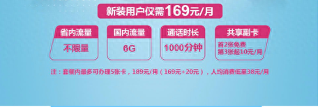 整个套餐169元/月,包含6G国内流量和不限量的省内流量,此外还有1000分钟的通话时长。如果只看单一用户的套餐费用,它并不算是十分优惠,但结合它能分享的特点,我们就能节省更多的金钱。这个无限流量套餐可以设置最多4张的共享副卡,首2张免费,第3张起10元/月,则如果1主卡+4副卡,整个套餐才189元/月,分到每个人头上才38元/月的套餐费用。