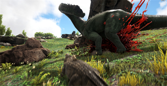 于是这个玩家就骑着恐鳄在陆地上开始找一些对手来练练手了,他先是找到了《方舟:生存进化》中的雷龙,这家伙虽然是一只草食性恐龙,但却有着上万的血量,对于一般的食肉动物来说是难以战胜的对手,可在恐鳄面前就像一张纸一样,一口咬下去在疯狂的流血,最后就活活的掉血给掉死了。