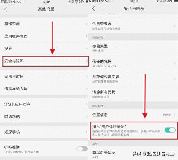 关闭步骤:【设置】--【其他设置】--【设备与隐私】--关闭【用户体验计划】