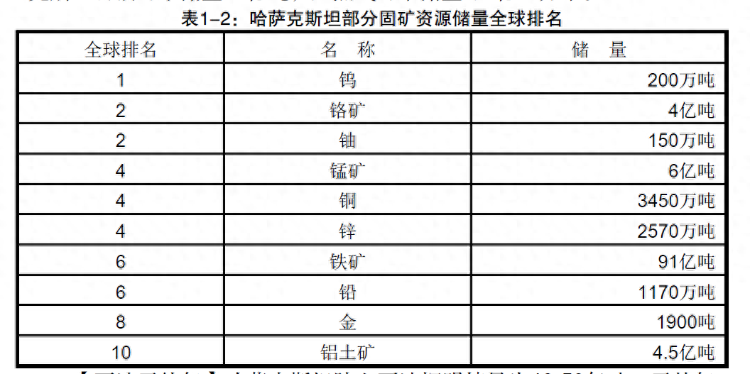 上图为哈萨克斯坦固体矿产资源储量全球排名表