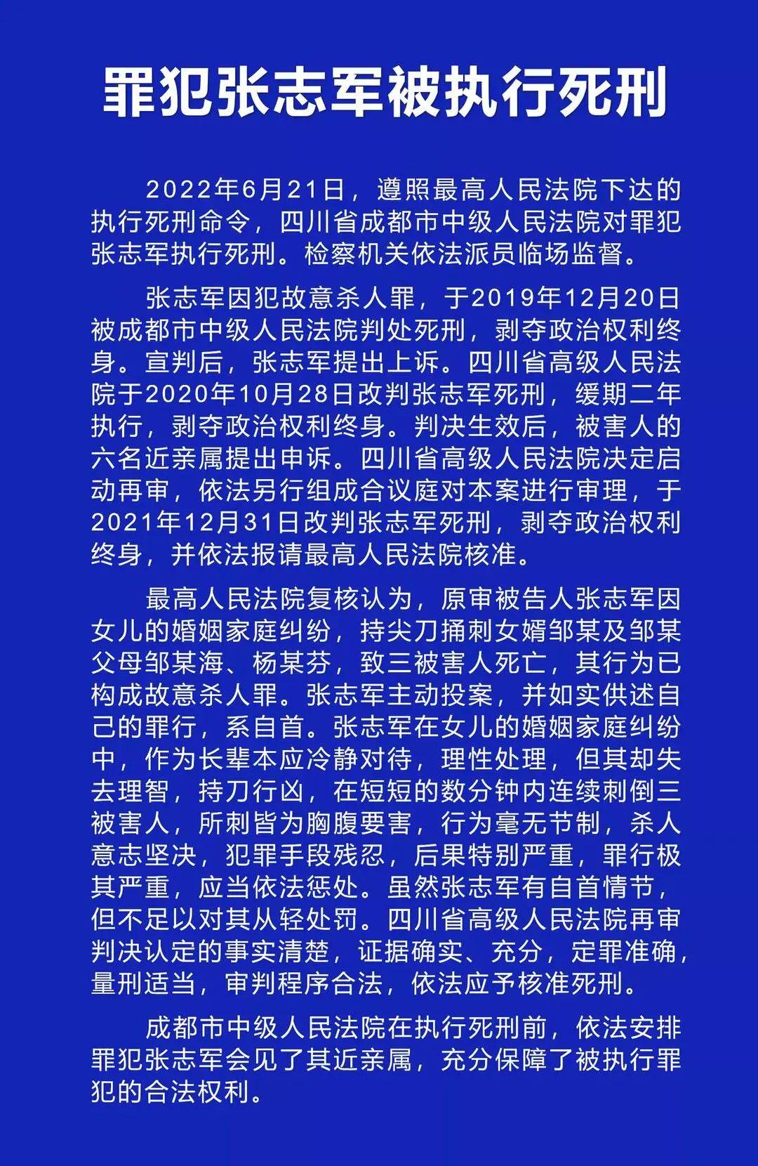 6月21日,四川省高级人民法院发布情况通报,当日,遵照最高人民法院下达的执行死刑命令,四川省成都市中级人民法院对罪犯张志军执行死刑。检察机关依法派员临场监督。