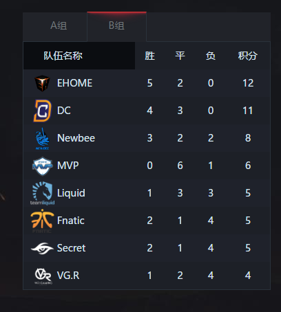 B组:EHOME、DC、Newbee、MVP 晋级胜者组,VG.R落到了倒数第一(果然yang还是关键啊)