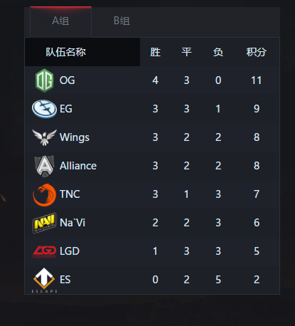 A组:OG、EG、Wings、Alliance 晋级胜者组,LGD则在倒数第二位 落入败者组