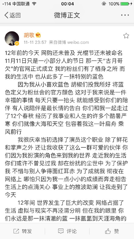华声娱乐11月12日讯 昨夜胡歌发长文祝贺古月哥欠12岁生日,感谢胡椒们(胡歌粉丝)的陪伴,因此胡歌微博被爆,胡歌说:“胡椒们投我所好 将蓝色定义为粉丝会的官方颜色 这对于我来说是一件幸福的事情 每天只要一抬头 就能感受到你们的陪伴”粉丝评论:胡歌太暖了!