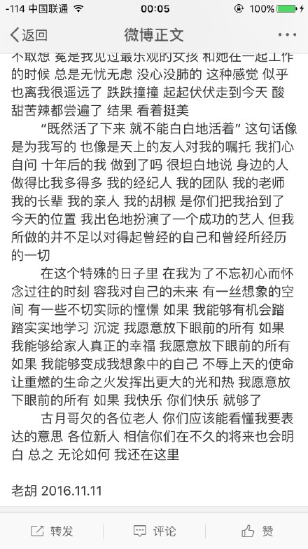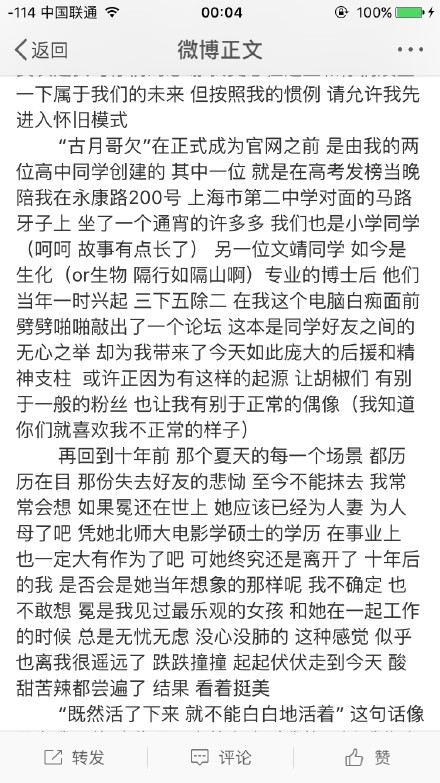 胡歌发长文祝贺古月哥欠12岁生日 导致微博被爆