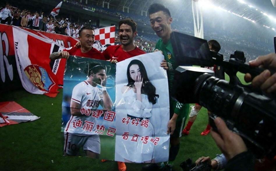 今天,权健击败全北赛后,全场球迷高喊迪丽热巴[污][污]王永珀还从球迷手中拿到一张帕托和迪丽热巴照片拼图来合影