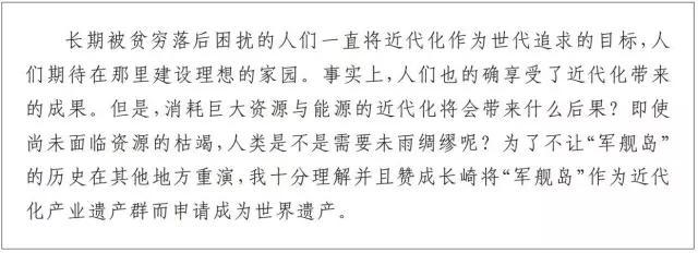 在这些游客面前,军舰岛成为了日本民族走向工业化的标杆和典范。而它的作为日本帝国主义掠夺史的另一面却被悄悄的隐藏了起来。就连中国的中日关系的研究专家步平教授在他的游记中也被日本人的思路带着走了。
