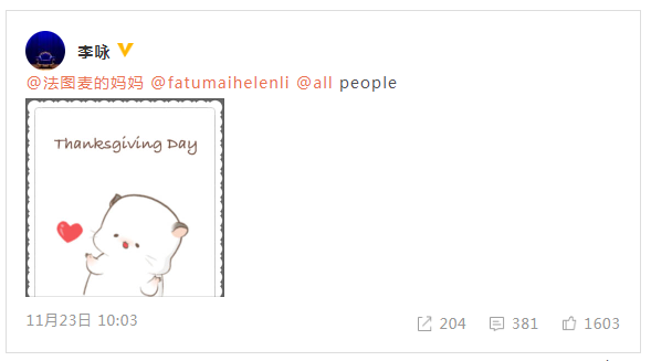 2017年11月23日,李咏于感恩节发布最后一条微博,感谢妻女及所有人。哈文在下方留言:“感恩节快乐。”