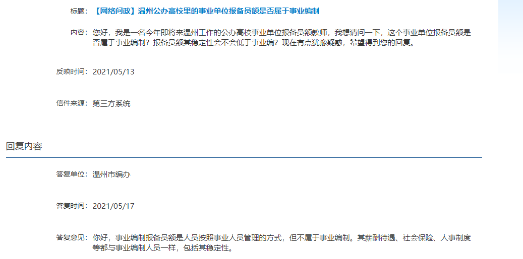 近日,我们有同学就在温州问政平台上咨询:“您好,我是一名即将来温州工作的公办高校事业单位报备员额教师,我想问一下,这个事业单位报备员额是否属于事业编制?报备员额其稳定性会不会低于事业编,现在就是有点犹豫疑惑,希望得到您的回复。”相信这位同学问的问题,已经差不多把大家想问的内容提出来了,而温州市编办也根据同学的问题详细的进行了解答。