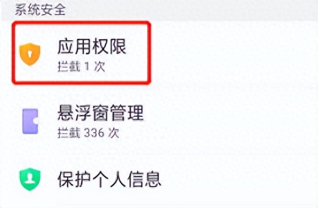 3. 在安全页面,选择“应用权限”,点击打开。