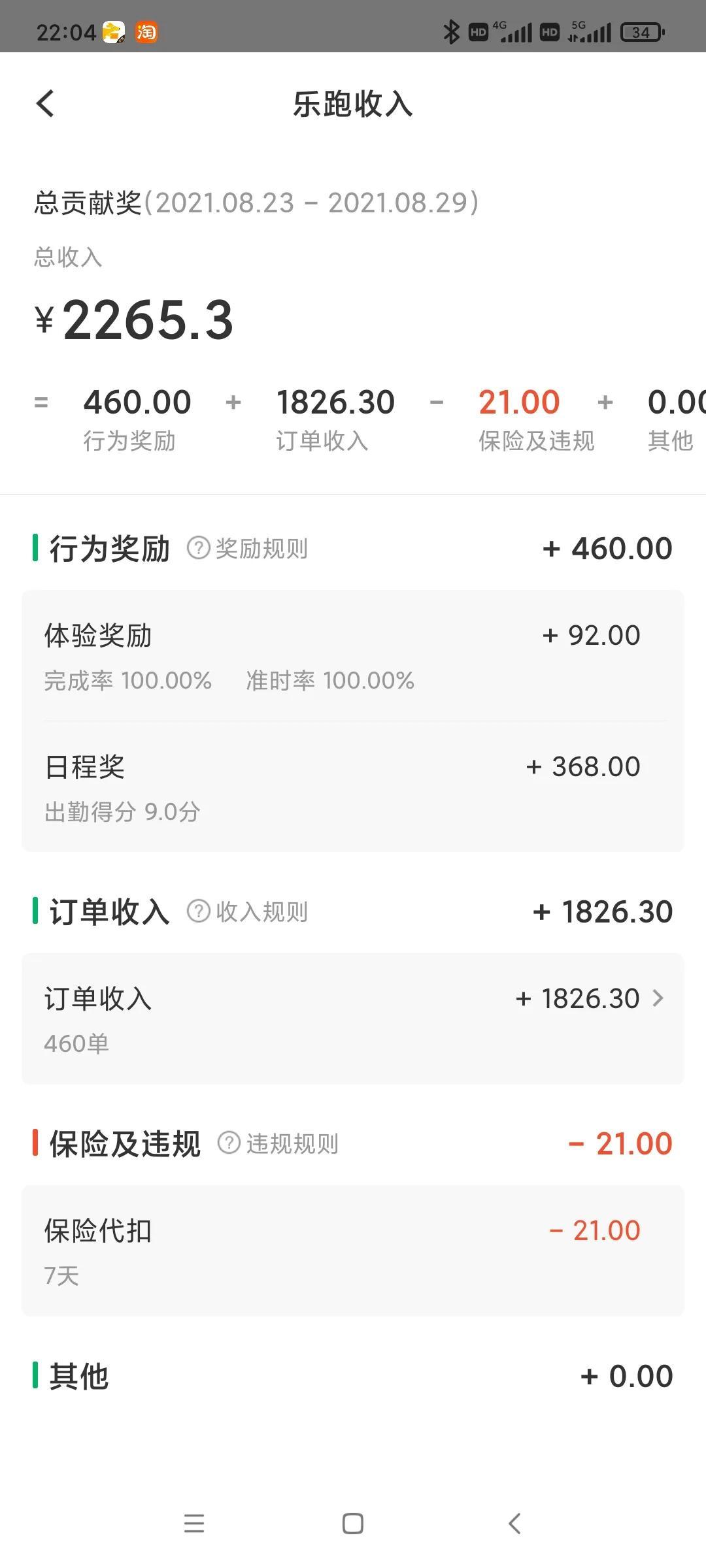 周三是我们乐跑发工资日,发的是上上周的工资。不知道其他区域的乐跑是不是也是周三发工资[what] ? 8.23号-8.29号这一周总共是跑了460单,平均每天66单。7天出勤扣掉每天3元的保险总共是发了2265.3元。平均下来的单价4.92元/单。还算知足了。但还是再加点油吧,争取每周能拿到2500元。这样月入1万的小目标就可以实现了。加油!!![点亮平安灯][点亮平安灯][点亮平安灯]