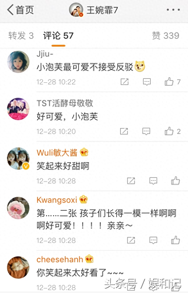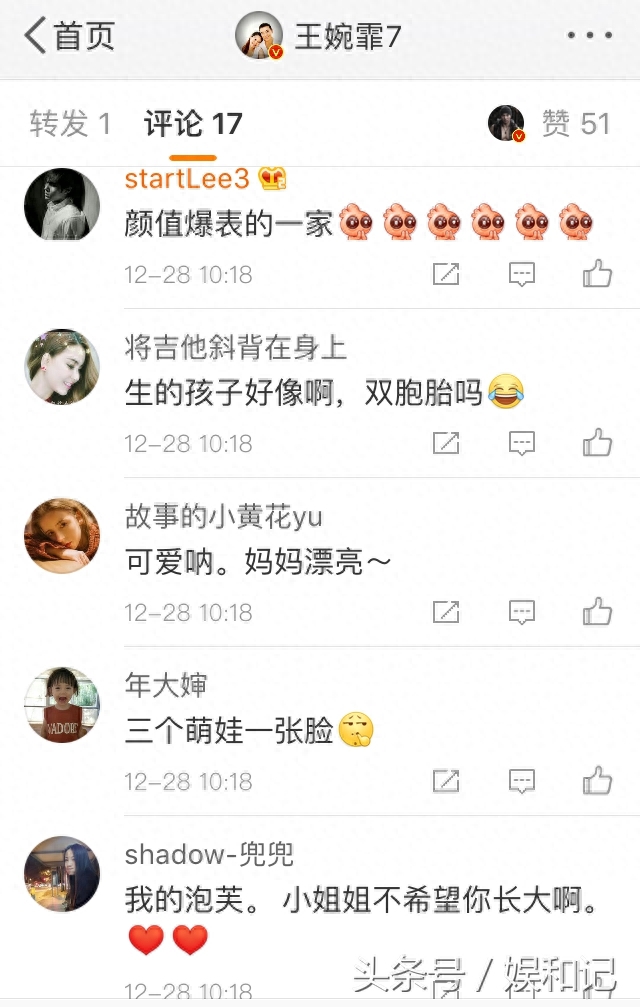 网友:“三个萌娃一张脸”、“第……二张 孩子们长得一模一样啊啊啊好可爱!!!!亲亲~”、“颜值超高的一家,幸福感爆棚的一家”!