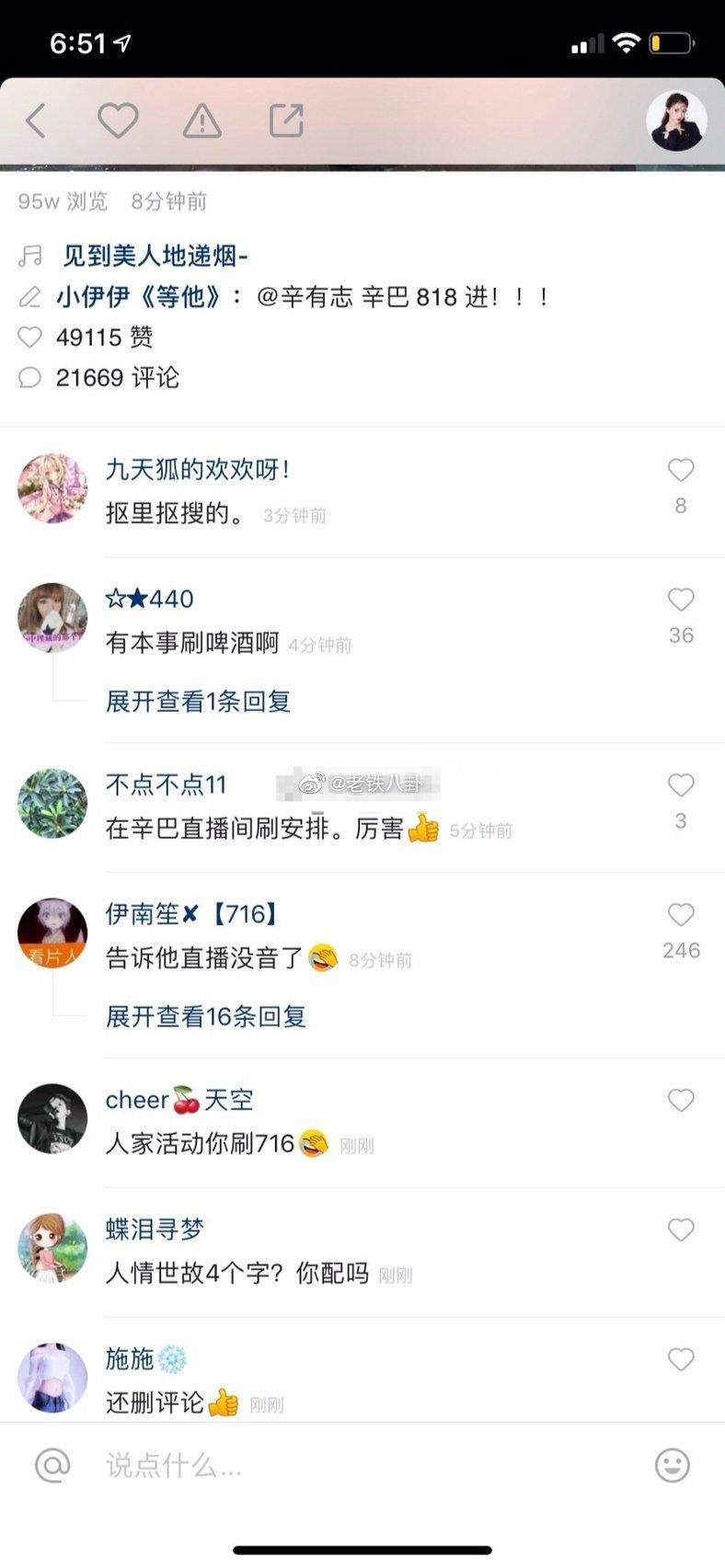 今晚辛巴办活动,小伊伊因为视频出的晚了,然后也比较敷衍,然后还在直播间刷1毛钱的礼物(当时牌伊结婚辛巴几百万的刷,还出了好多视频),因为这个粉丝开始疯狂给小伊伊带节奏,说他不懂人情世故。