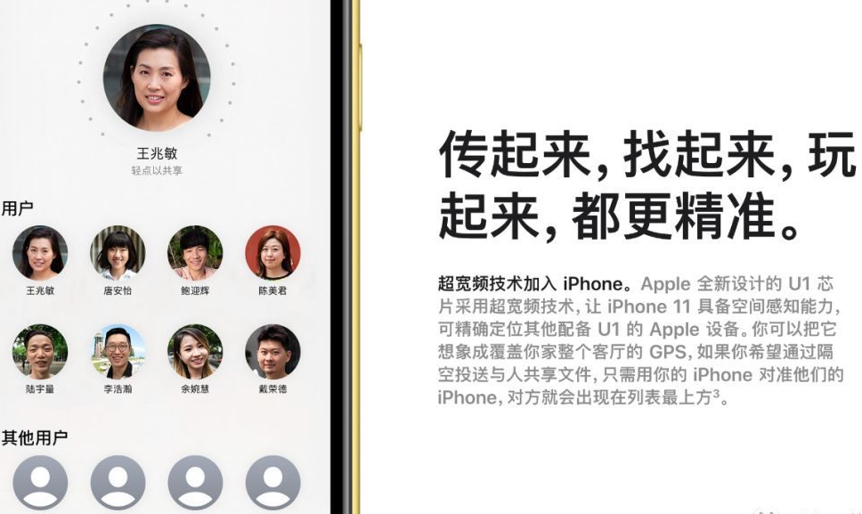 “Apple全新设计的U1芯片利用超宽频技术实现了空间感知,让iPhone 11 Pro能够精确定位其他同样配备U1的Apple设备。这就像为iPhone增添了另一种感知能力,将会带来许多精彩的新功能。有了U1芯片和iOS 13,在使用隔空投送时,只需将你的iPhone指向其他人的iPhone,系统就会为对方优先排序,让你更快速地共享文件。”——苹果官网