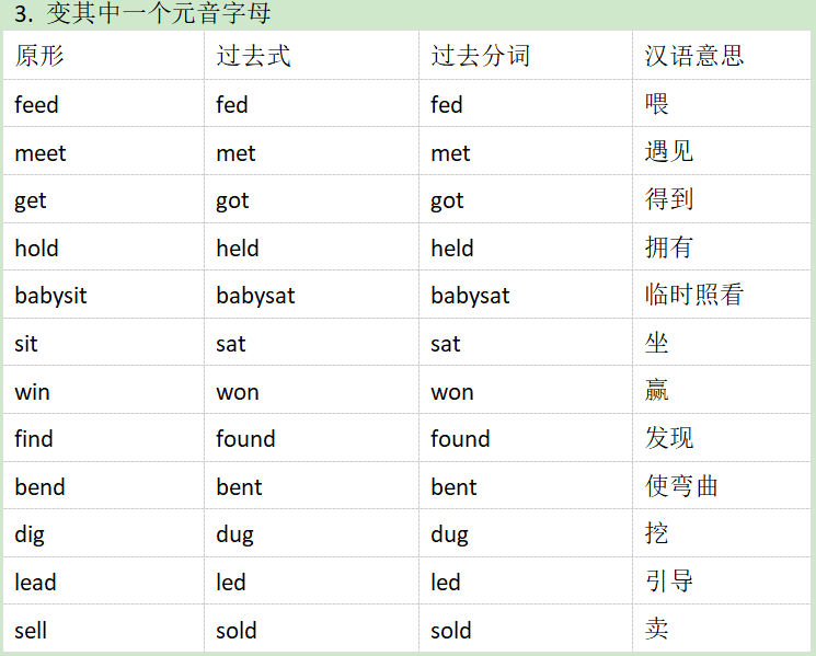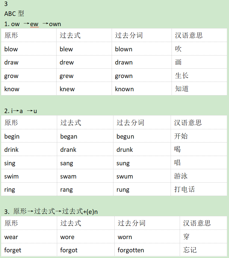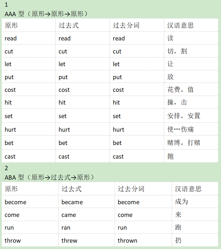 不规则动词的过去式和过去分词大致可以为AAA型(原形、过去式和过去分词都一样)ABA(原形和过去分词一样,过去式不一样)ABB(过去式和过去分词一样)ABC(原形和过去式和过去分词都不一样)