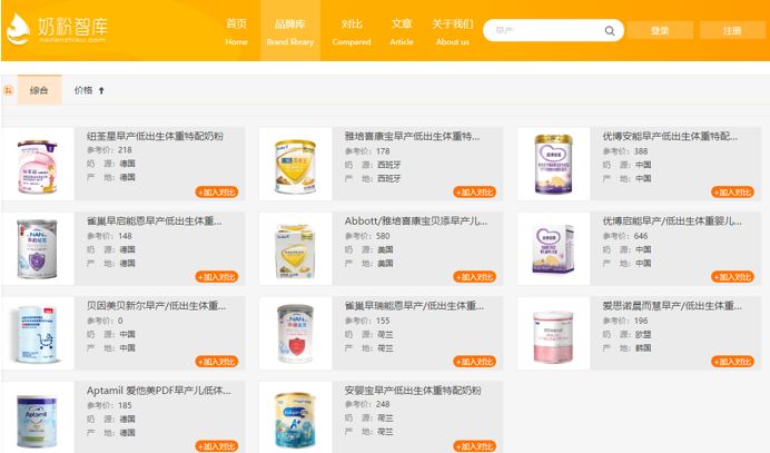 首先大家点开奶粉智库网,在搜索栏中输入“早产“两个字,即会出现12款跟早产相关的奶粉或婴儿营养补充剂,如下: