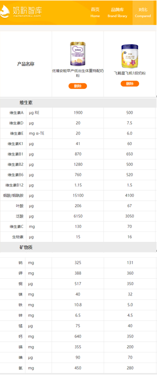 那早产儿奶粉和普通奶粉之间到底有什么区别呢?为了方便大家理解,我们还是用奶粉智库非常好用的“比奶粉”功能来进行对比。我们选取市面上目前品牌力还不错的优博安能早产低出生体重特配奶粉和普通奶粉中品牌力不错的星飞帆1段来进行维生素和矿物质的展示,见下图。