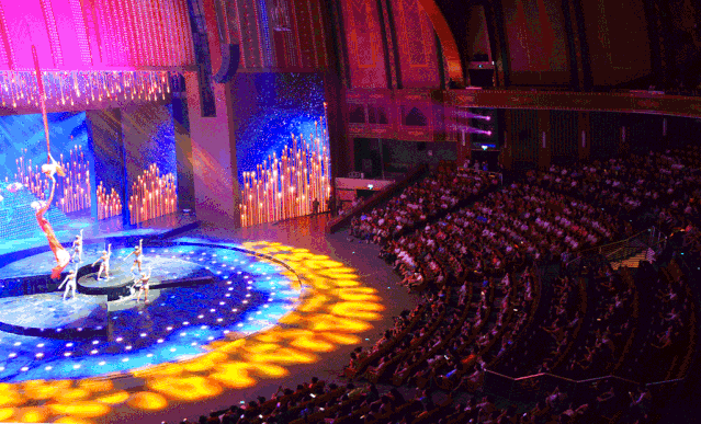 在巴黎大戏院上演的《百老舞汇》,是一场大型水舞秀。通过充满沉浸感的、行进式的表演,带领大家体验上世纪三四十年代老上海的多样文化。它与《梦幻太极》《暴雨山洪》并称为“横店三大秀”。