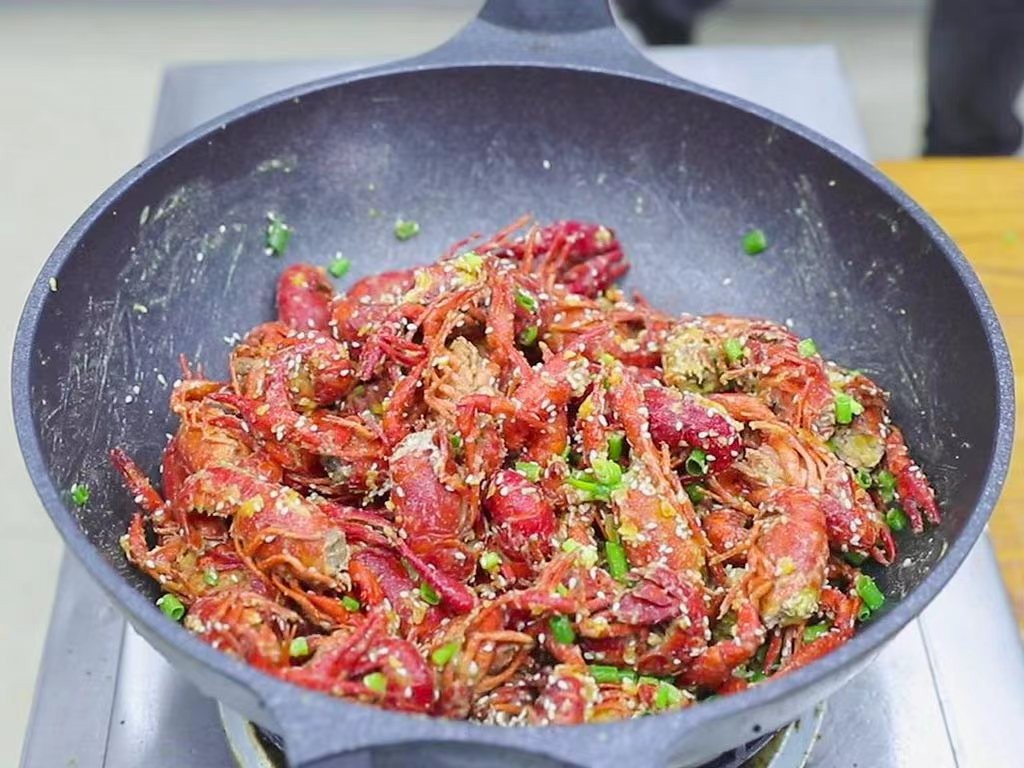 5、锅底留油,将咸蛋黄用小火不停地翻炒。炒到咸蛋黄起泡,下入炸好的小龙虾、葱花、白芝麻翻炒均匀即可出锅。
