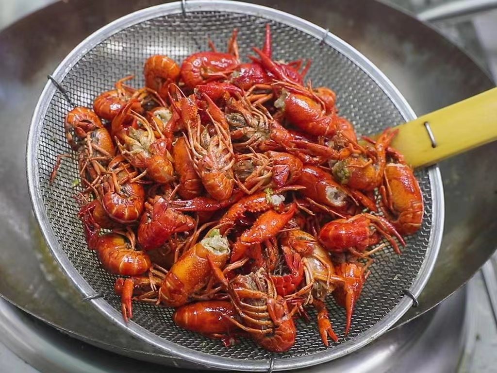 3、把油锅内的残渣捞干净,油温升高准备第二次复炸,复炸时间不能太长,大概15秒左右即可捞出,不然龙虾肉质会变老。咸蛋黄焗小龙虾复炸是为了把小龙虾的外壳炸到焦酥,这样做出来的小龙虾不仅外壳酥脆,肉质也会很鲜嫩。