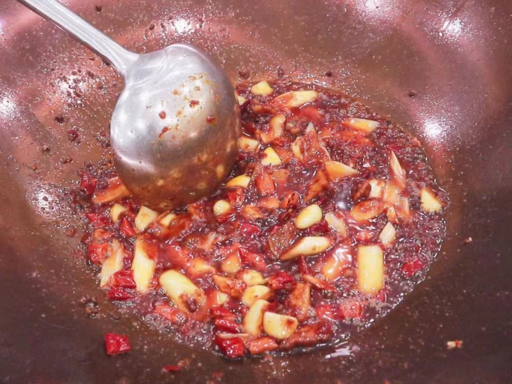 3、锅内留底油把底料炒一下,油烧热以后放入葱姜和泡椒,翻炒出香味。倒入花椒、麻椒等料,翻炒出香辣味。随时观察干辣椒的颜色,免得炒糊。再把酱料倒入锅中,快速搅拌化开酱料。炒出豆瓣酱的红油和香味时,就沿锅边淋入适量清水,加入料酒5克去腥、生抽5克、白醋5克搅拌均匀。